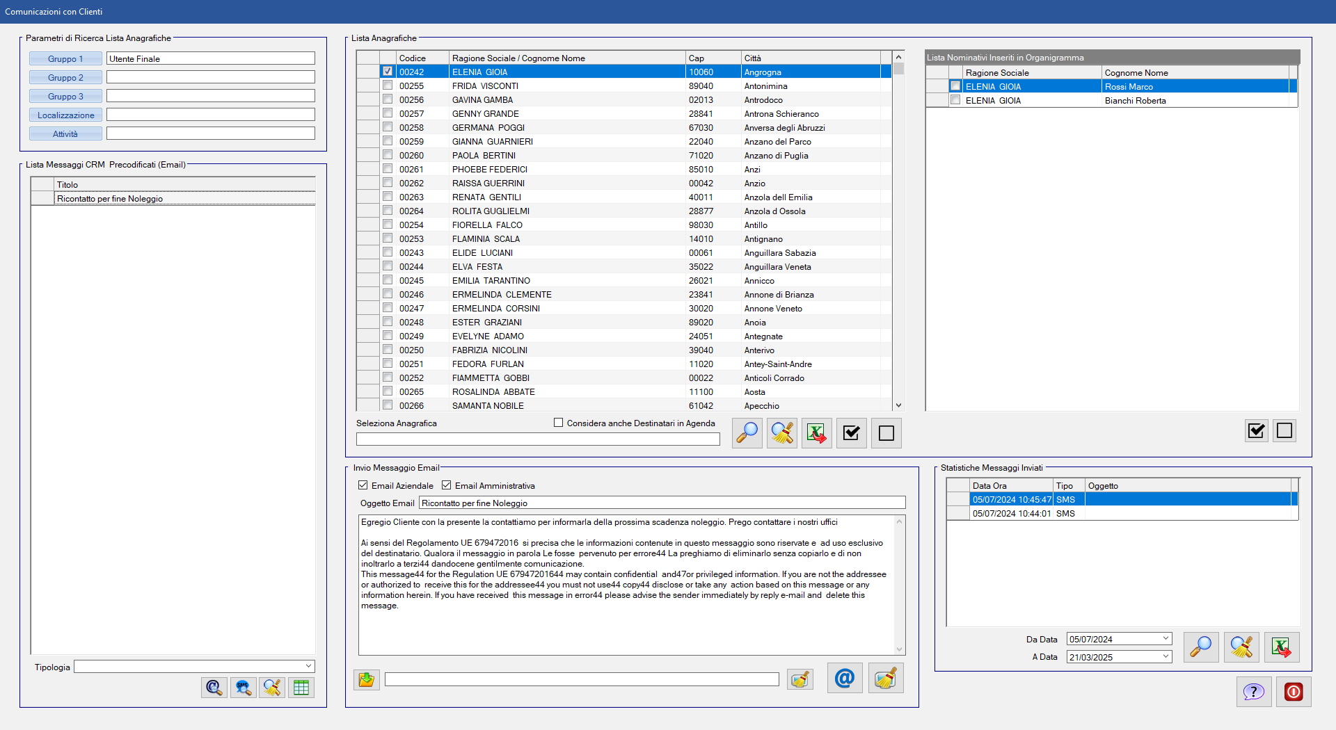 Le anagrafiche per l'invio delle comunicazioni possono essere filtrate tramite la ricerca per tipologia cliente, localizzazione e attività ed i messaggi email e sms possono essere precodificati.