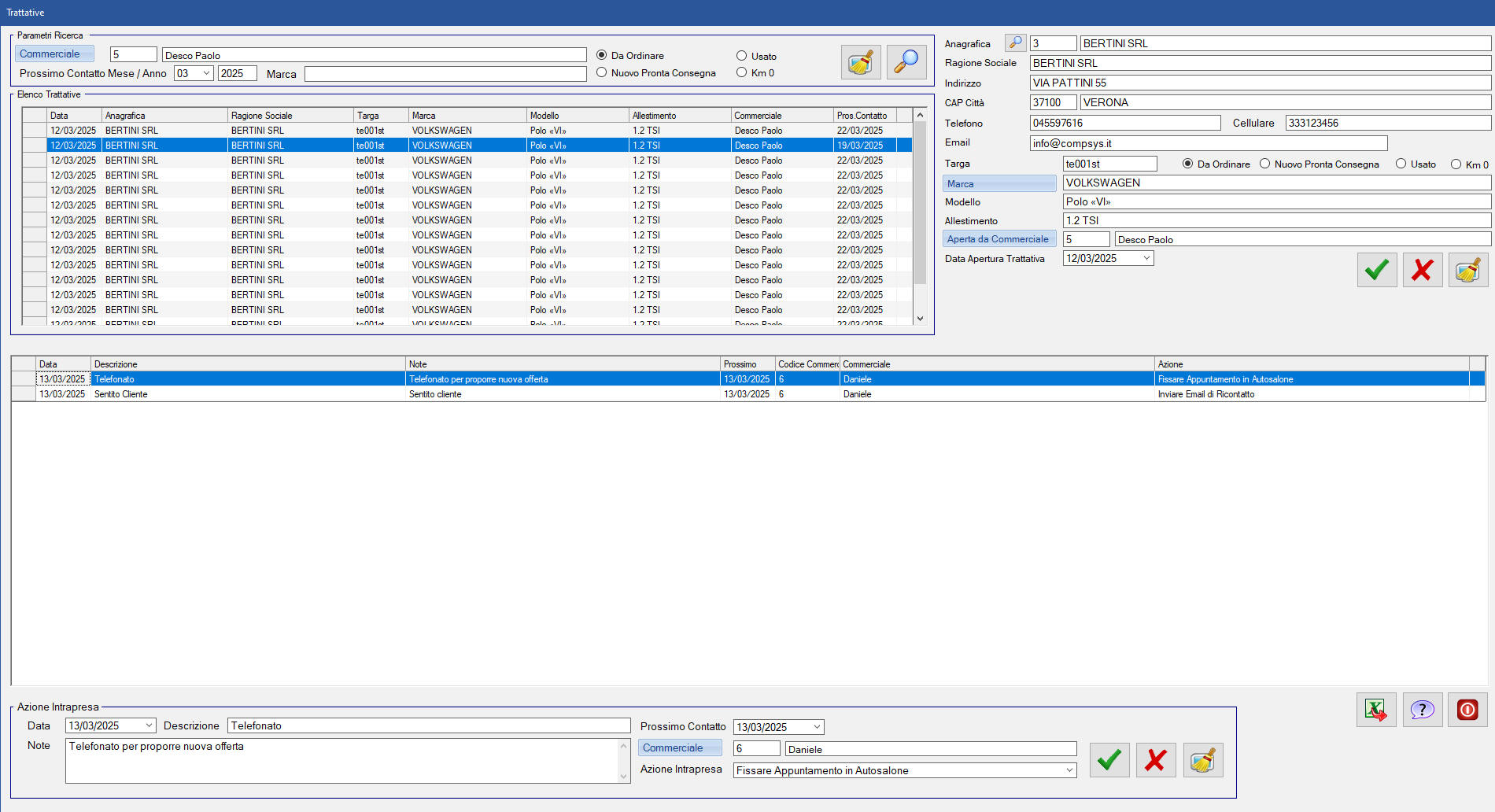 Il software consente di generare e monitorare ogni opportunità di vendita. Ogni trattativa è collegata a un cliente specifico, al veicolo di interesse (o a più veicoli) e ai dettagli pertinenti alla vendita.